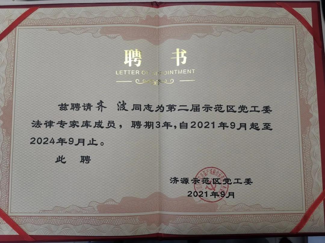 重磅!我所齐波律师受聘济源示范区党工委法律专家库成员