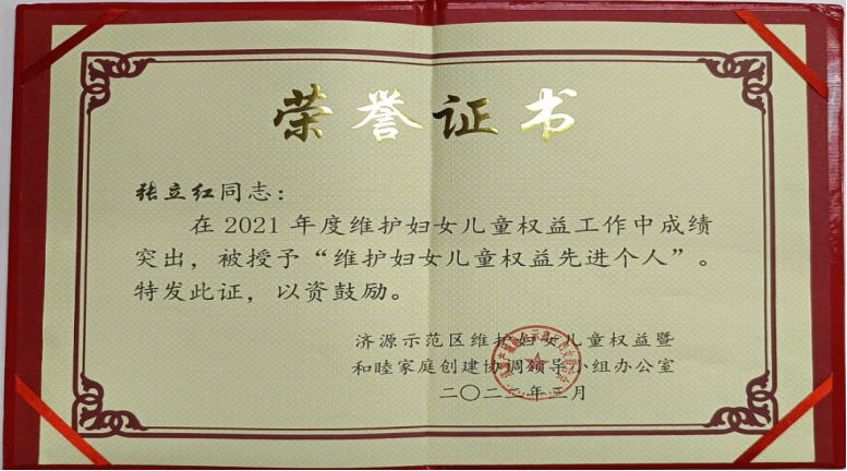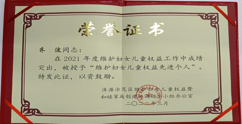 来源:朗齐律所 作者:管理员 时间:2022-03-20近日,济源示范区维护妇女儿童权益暨和睦家庭创建协调领导小组办公室对全示范区在维护妇女儿童权益工作实践中涌现出的先进典型进行了表彰,河南朗齐律师事务所齐波律师、张立红(实习)律师荣获“2021年度维护妇女儿童权益先进个人”荣誉称号。