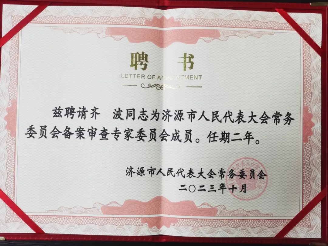为切实增强济源市人大常委会规范性文件备案审查工作实效,充分发挥专家学者在备案审查工作中的重要作用,按照《济源市人民代表大会常务委员会备案审查专家委员会工作办法》,经过选聘程序,我所主任齐波被聘为济源市人大常委会备案审查专家委员会成员。