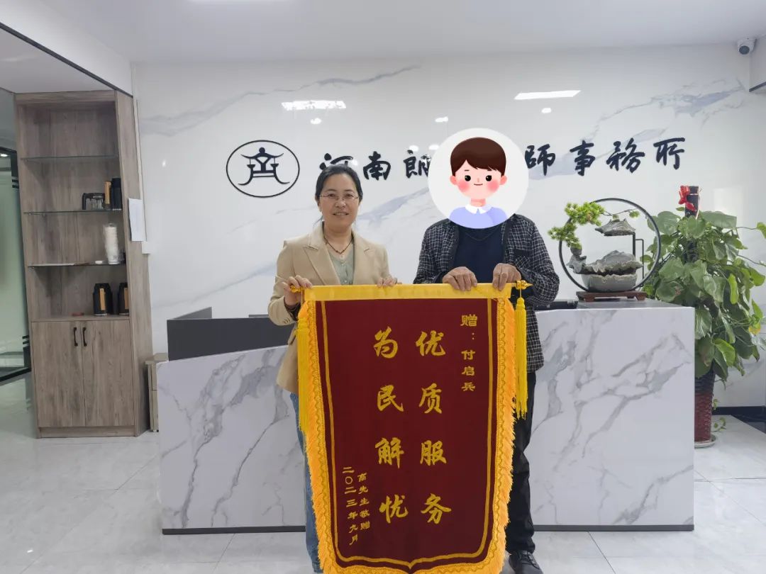 一面锦旗,一份责任,满分肯定。锦旗既是对我所付启兵律师的肯定,更是对河南朗齐律师事务所全体人员的鞭策与激励。河南朗齐律师事务所将持续践行使命愿景,不断提升专业能力,为当事人提供优质高效的和量身定制的法律服务,办好每一件案子,切实维护好当事人的合法权益!